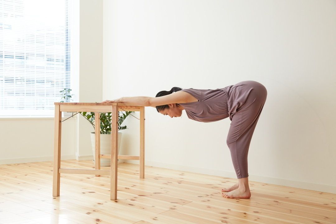 犬が伸びをしているようなダウンドック。床に手をつける本来のポーズは苦手という人も多いけれど、机を使えばラクチン♪肩、背中、腰、脚と、体の背面をグーッと伸ばすことで、全身の巡りがアップ。心も落ち着き、ストレス解消にも◎。全身を引き締める効果もあります。