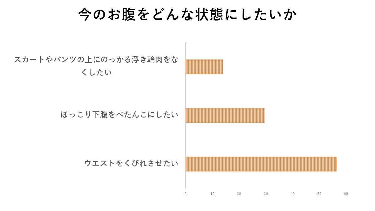 今のお腹をどんな状態にしたいか、3つの理想から選んでもらったら、56.6%の人が「ウエストをくびれさせたい」と回答。続いて29.5%が「ぽっこり下腹をぺたんこにしたい」、13.9%が「スカートやパンツの上にのっかる浮き輪肉をなくしたい」と答えました。
