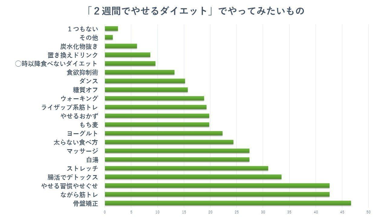 2週間でヤセるダイエットでやってみたいものはどれか、複数回答で答えてもらいました。数ある中でトップ3は46.7%「骨盤矯正」、続いて42.5%「ながら筋トレ」、42.5%「やせる習慣」でした。