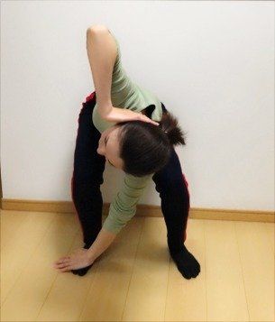 かがむような姿勢で、右手を右耳にあて、左手で、右足の足先を触ります。