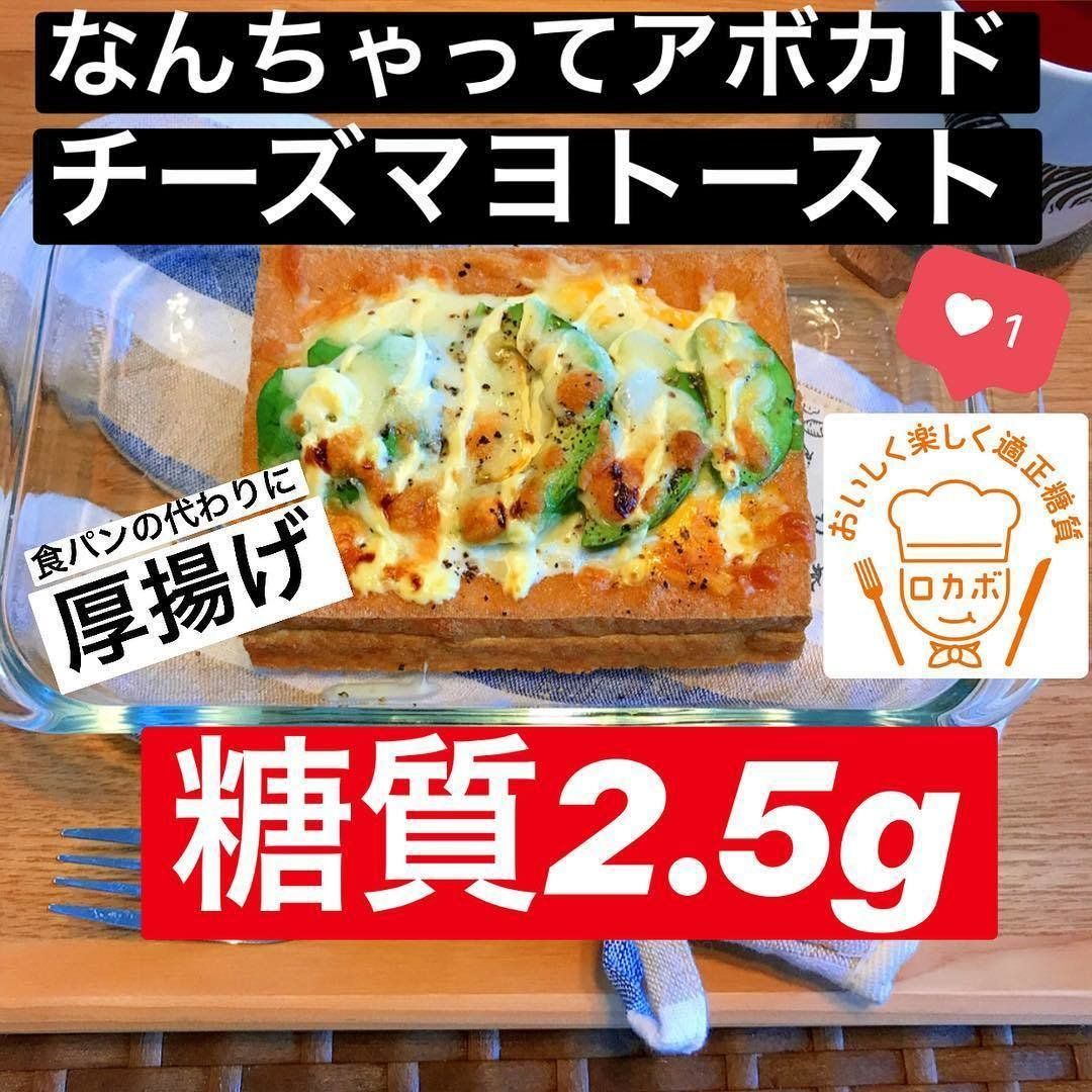 こちらは、厚揚げをパンの代わりに使ったレシピです。厚揚げの真ん中をくり抜いたら卵を入れて、爪楊枝で黄身を3か所ほど刺し、電子レンジで温めます。そこに、アボカド、チーズをのせてマヨネーズをかけ、オーブンでチーズがこんがりなるまで焼いたら完成!アボカドやチーズ、厚揚げも意外な低糖質食材なので、ぜひ活用していきたいですね。