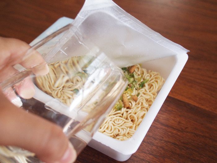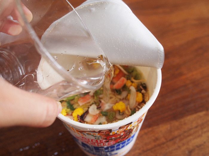 備蓄品として保管している方も多いと思われるカップラーメン。こちらも水だけで調理する方法があるのです!やり方はとっても簡単。こちらも規定量まで水を入れることのみ!そして20分くらい放置!どんな味に仕上がるのでしょうか…?
