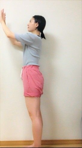 壁に両手を付けます。なるべく高い位置におきましょう。