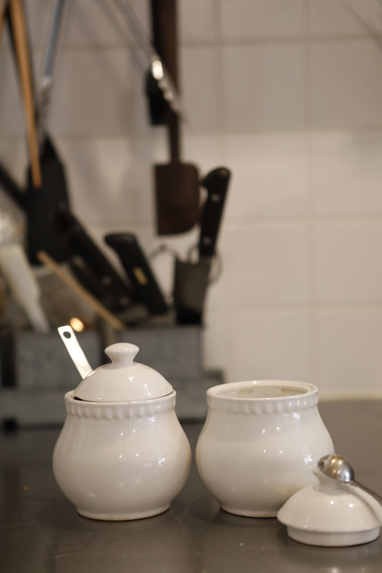 台ふきんと食器拭き用クロスはかごに入れ、調理中いつでも手の届く位置にスタンバイ。汚れたり湿ってきたりしても、いちいち洗わず次々と使えるよう2〜3枚常備します。よく使う塩・砂糖は、調理台に出しっ放しに。塩は小さじ½(2.5g)スプーン、砂糖は小さじ(5g)スプーンを合わせてセットしておくと、計量もスムーズです