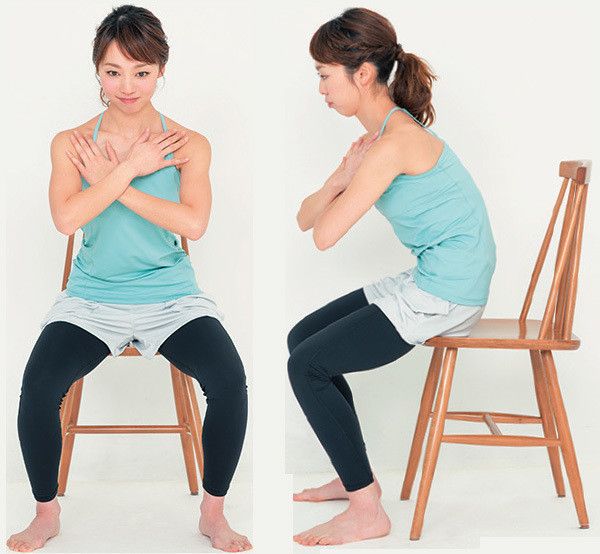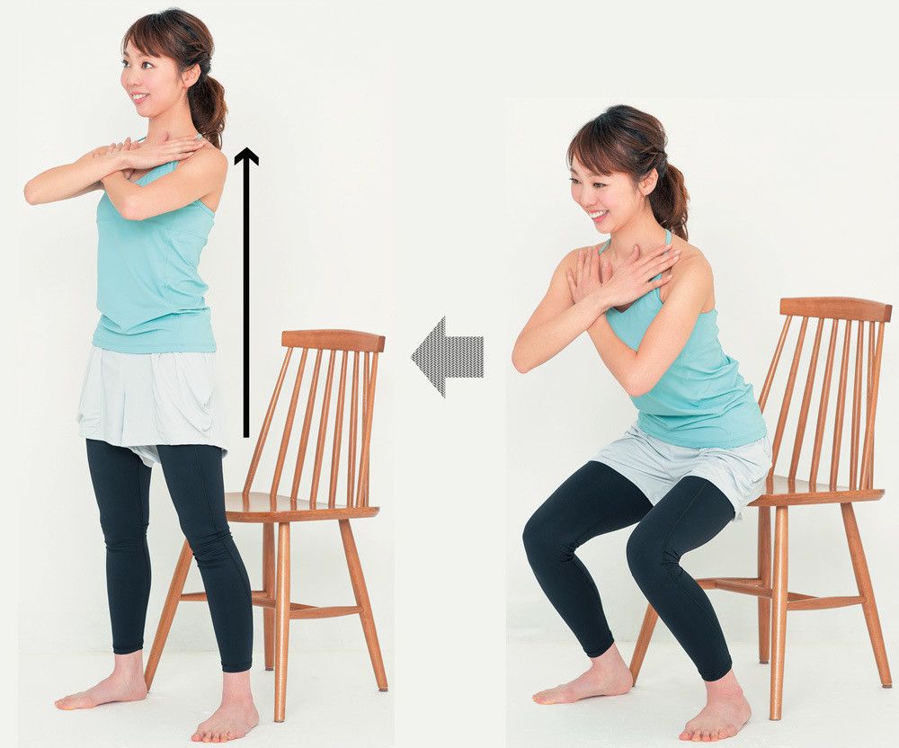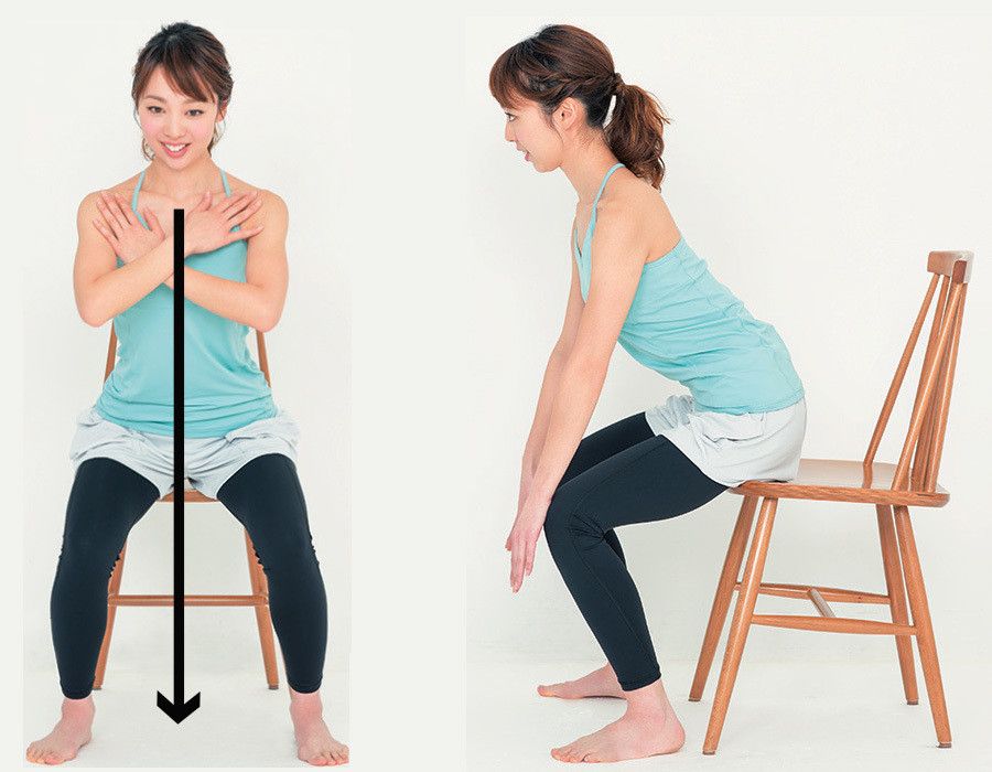 つま先を少し外に向けて足を肩幅に開き、いすに浅く腰掛ける。つま先がひざより10㎝以上前に出ないよう、いすの脚にかかとを寄せる。両手を胸の前で交差し、背すじを真っすぐにしたまま前傾する