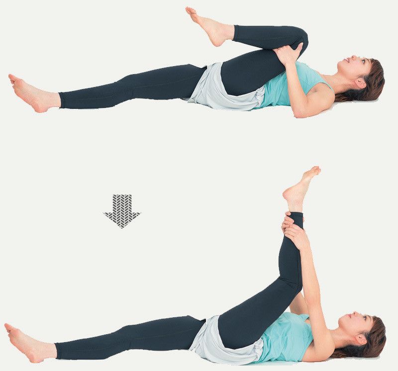 あおむけに寝て、片方のひざを曲げ、両手をひざの後ろに添えて、胸のほうにゆっくり引き寄せる。ラクに呼吸をしながら10秒キープ。足を入れ替えて同様に