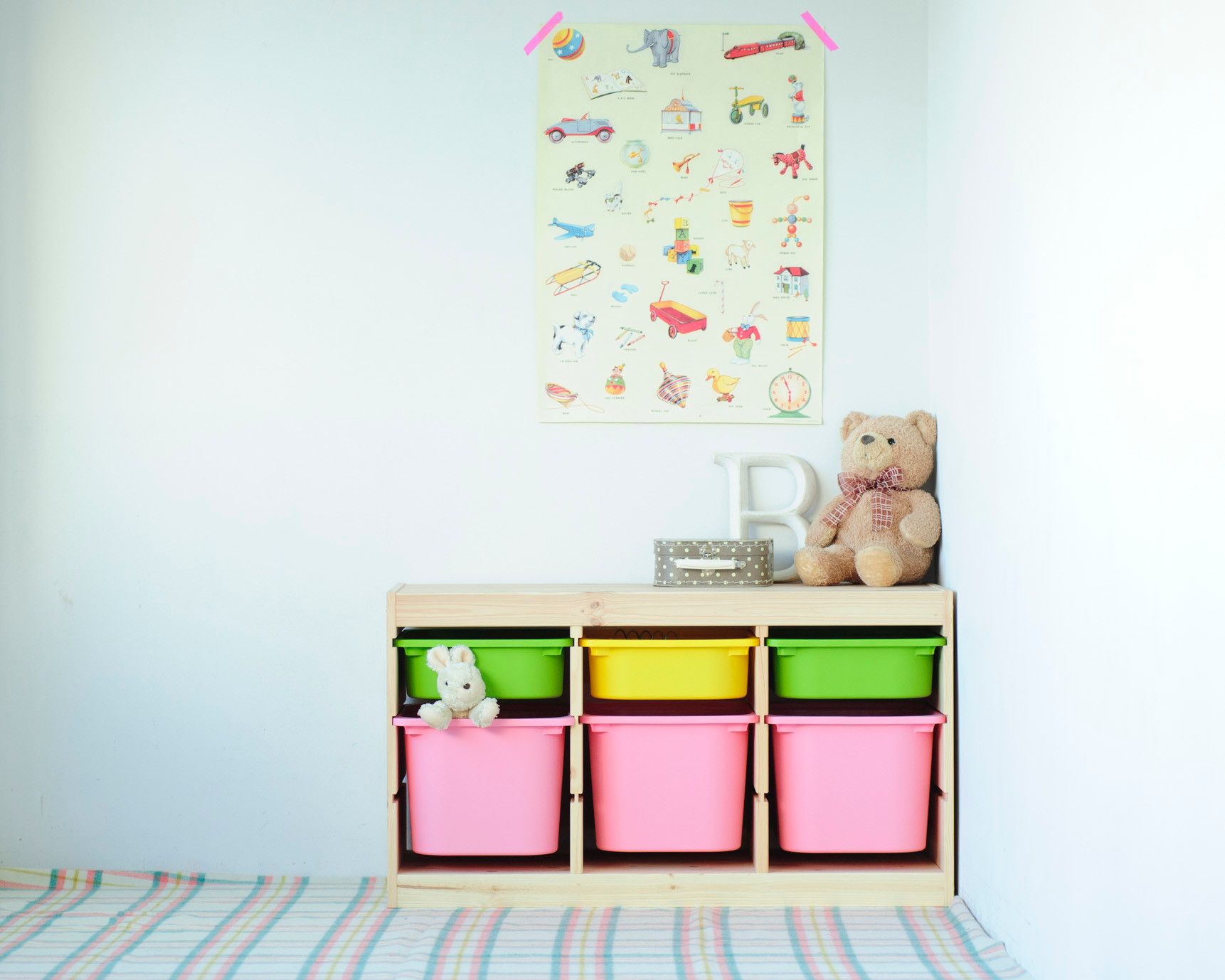 木製のフレームにプラスチック製のBOXを組み合わるタイプで、おもちゃ収納として爆発的人気! 子どもの身長を考慮した低めの設計で、片づけの練習としても最適です。BOXはモノトーンからカラフルなものまで全6色で、大きさは4種類。用途に合わせてアレンジできちゃうから、成長後もずーっと使えます。