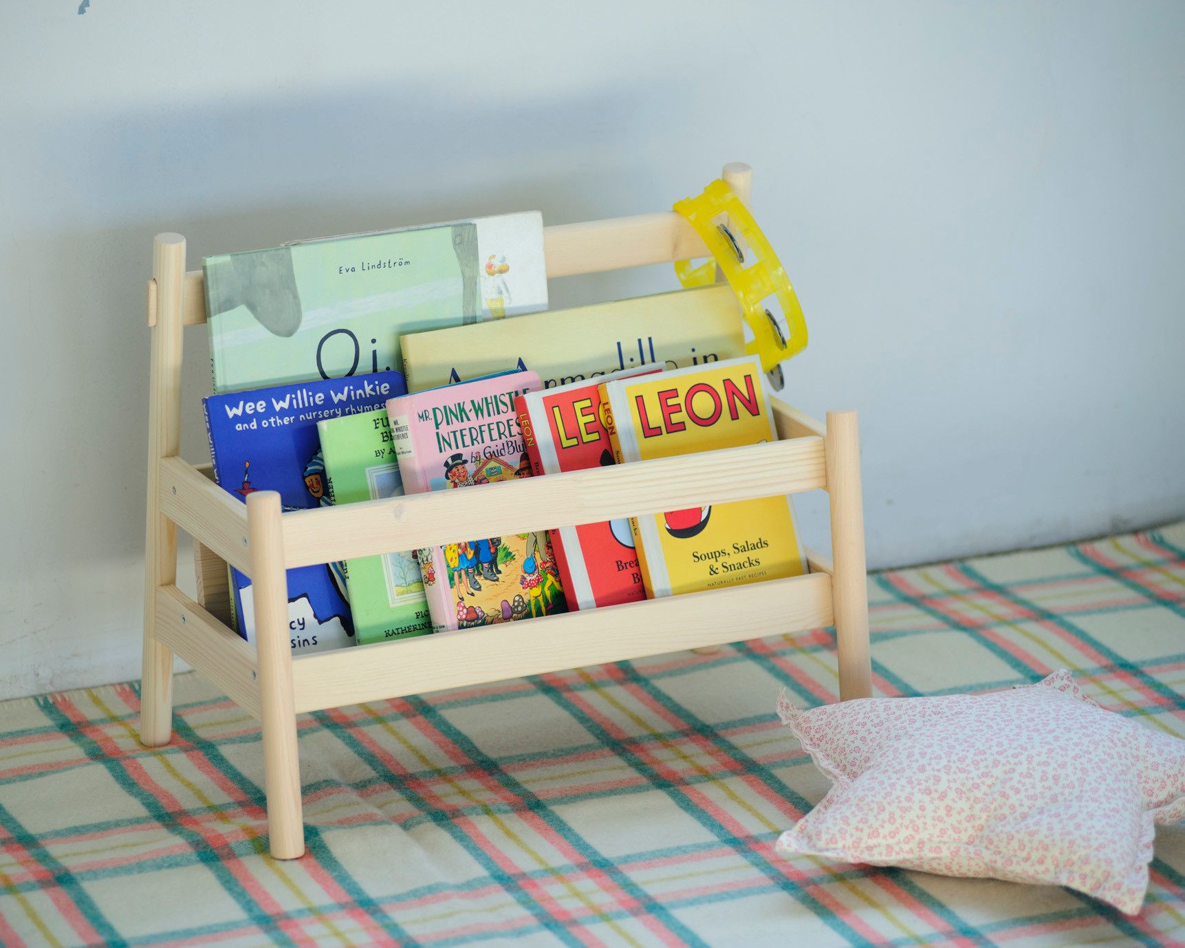 本の表紙が見える「子ども目線の収納」なので、子どもが自分で取り出しやすく、片づけもワンアクションです。ざっくりしまえてインテリアにもなるビジュアル。ぬいぐるみやガーデニングの収納にもおすすめ。簡単な組み立て式です。
