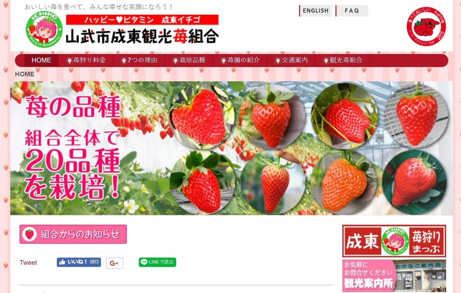 19軒のいちご農園が加入している山武市の苺組合です。農園によって栽培している品種が違うので、ドライブしながらいろいろないちごの食べ比べをするのも楽しそうですね。公式ホームページには成東苺狩りマップも用意されているので、お出かけの際はダウンロードしておくと便利です。また、いちご狩りの時間は40分。長めの時間設定なので、食べるのがゆっくりなお子さんでも満腹になりそうです。