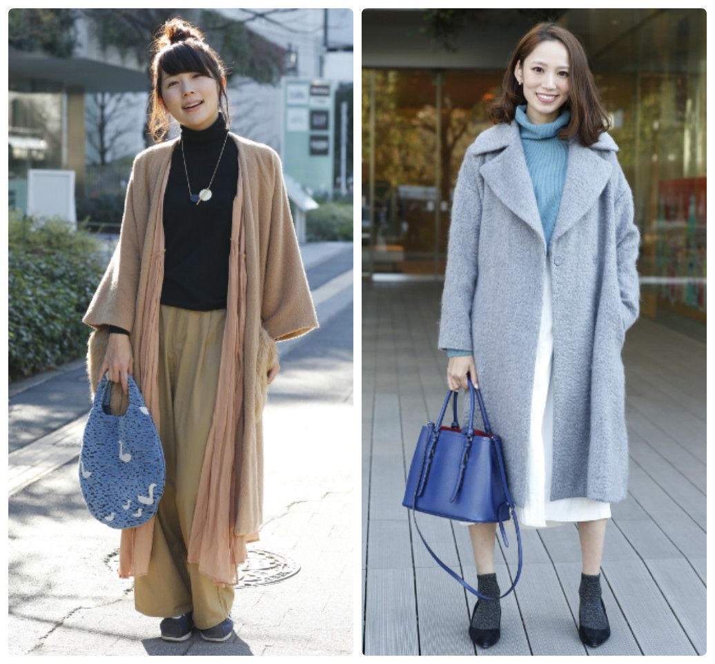 淡色のアウターも今年のトレンド! アウターに淡色を加えるだけで、ぐっとやわらかな女性らしさたっぷりのスタイルになります。写真左のコーデは、インナーに黒を合わせて、コーデ全体を引き締めているところがグッド。メリハリが出て引き締まります。アウターをガウンと一緒に重ね着してグラデーションにしているところも◎。写真右のコーデは、全体を同じ色のトーンにし、そこに小物のバッグを濃い色にしてコーデ全体にまとまり感を出しています。