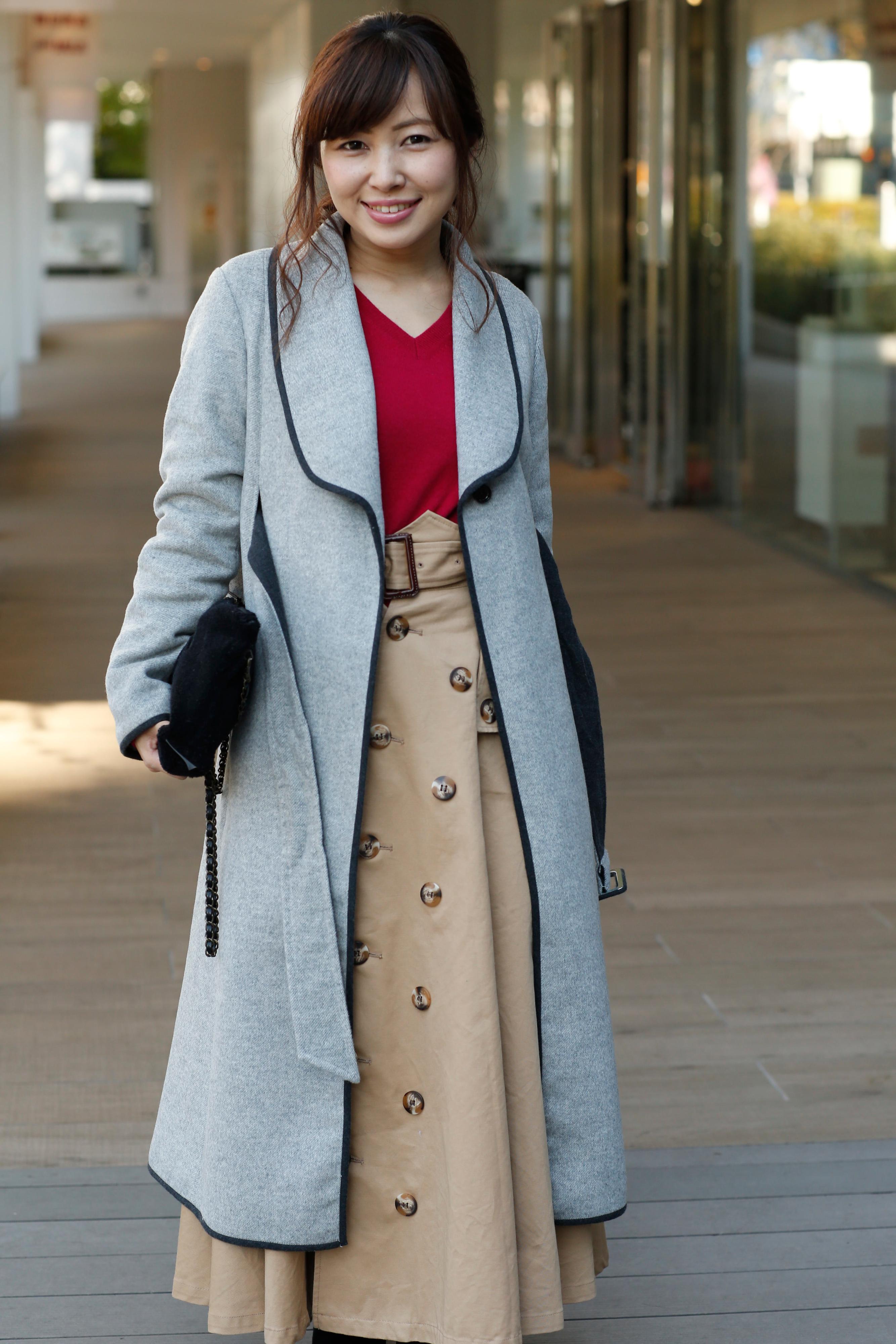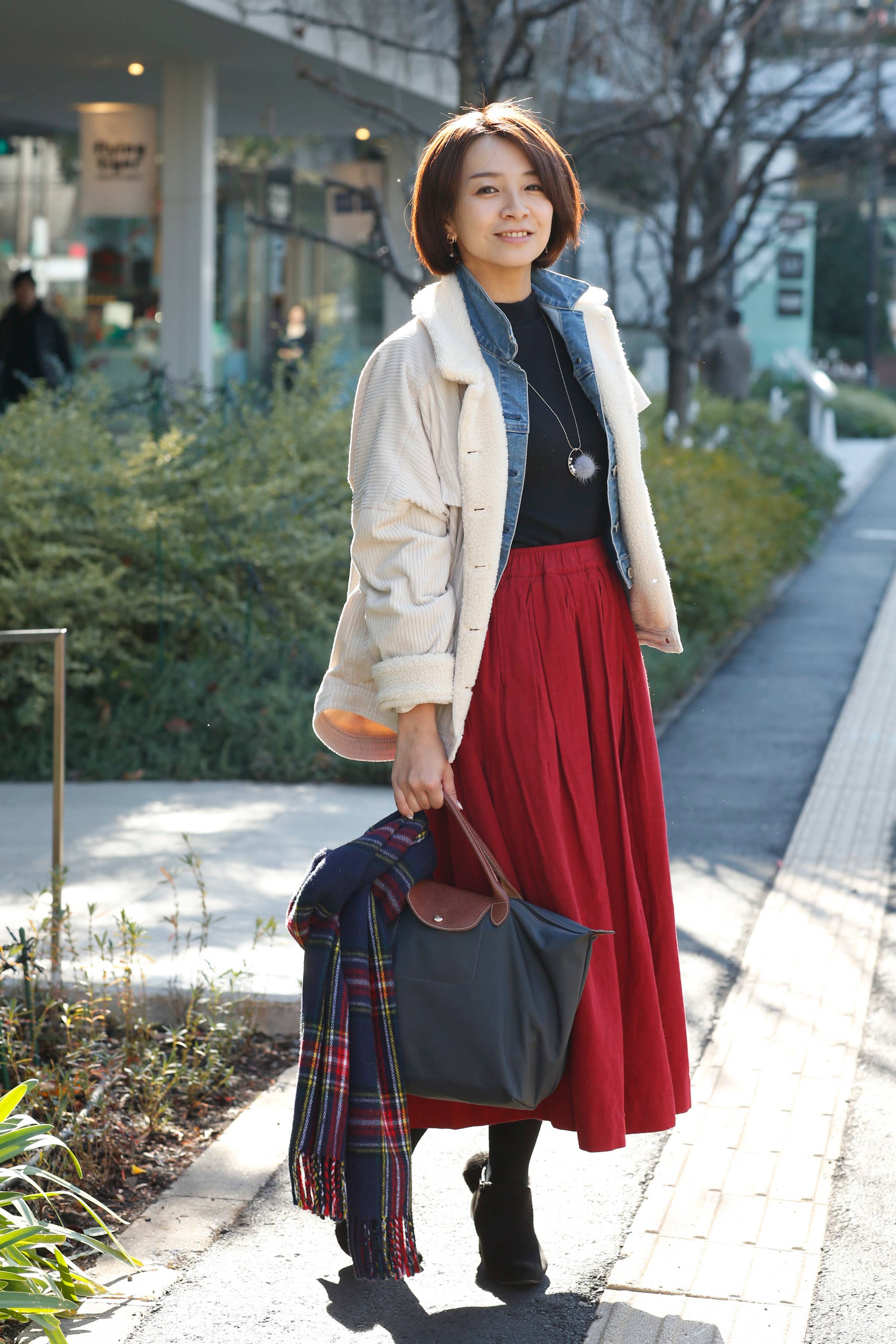 アウターが鮮やかな白なので、自然と赤のスカートが引き立つ計算されたスタイル。プリーツスカートにしたことで、きちんと感も出ています。