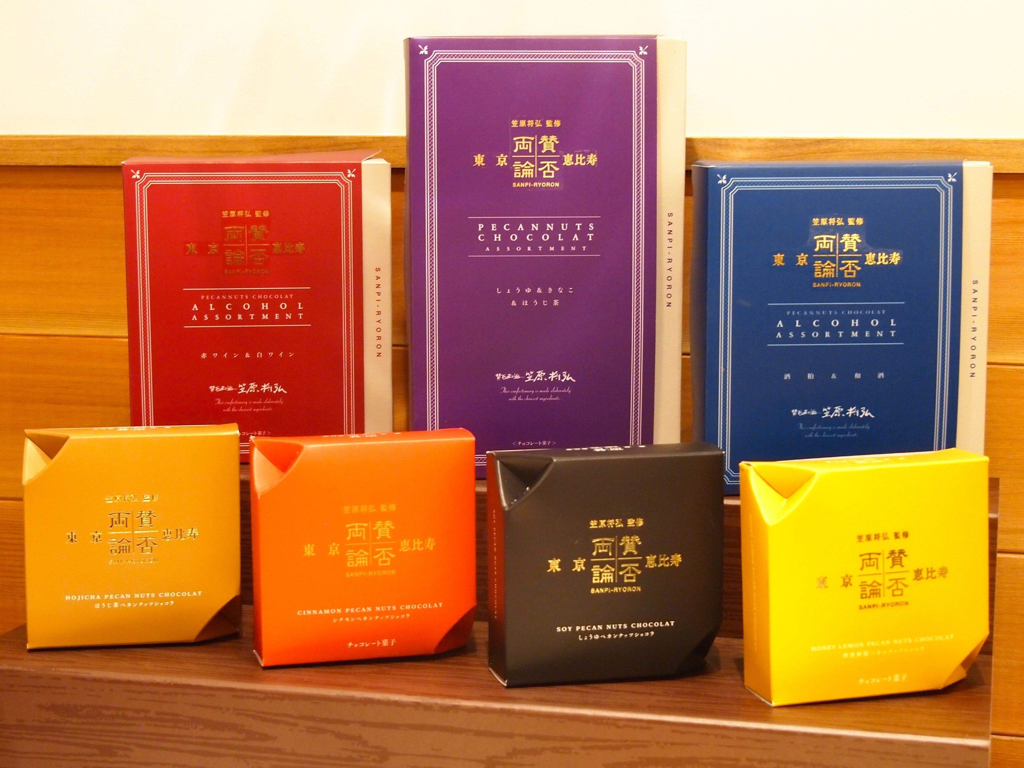 ペカンナッツショコラは、しょうゆ、ほうじ茶、赤ワインなど全部で9種。単品も詰め合わせもあり。