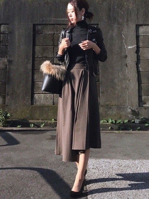 タートルニットがユニクロのもの。プレーンでフィットするタートルニットは、厚手のタートルニットよりも女性らしくきれいめな着こなしにピッタリ◎ハードなイメージのラムレザーのライダースジャケットを、ニット×スカート×パンプスできれいめに着こなしたコーデ。スカートのアシンメトリーな裾が大人可愛い!スカートはFurryrate、ライダースジャケットは603のもの。