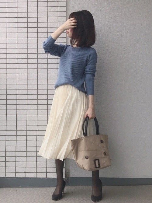 ユニクロのコットンカシミヤリブセーターのコーデ。ボートネックで細リブのニットは、女度が上がる優秀アイテム◎サックスブルーのニットに白のプリーツスカートが上品な色合わせ。プレーンなパンプスを合わせれば、通勤コーデにも対応できますね◎スカートはGUのもの。
