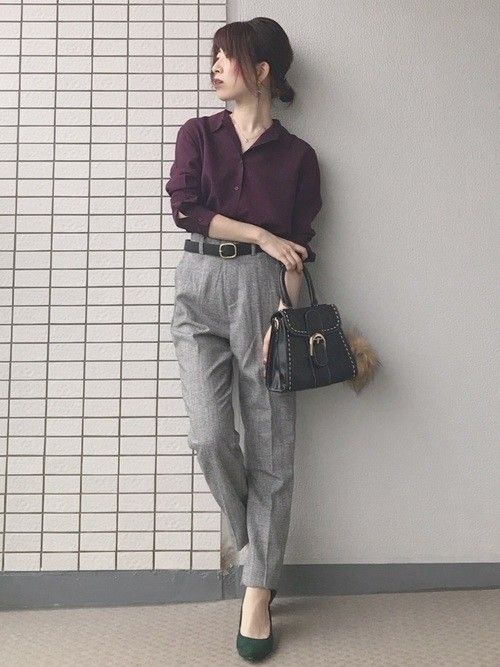 ユニクロのレーヨンアリーブラウスのコーデ。レーヨン素材ブラウスは、シワになりにくくお手入れが簡単なのが魅力!ぶどう色が秋らしく、定番コーデに差が付くポイント。グレンチェックのセンタープレスパンツにベルトでウエストマークして、きちんと感たっぷりに。首元を開けて小ぶりのネックレスをのぞかせるのが女性らしいですね◎パンツはKOBE LETTUCE、バッグはfifthのもの。