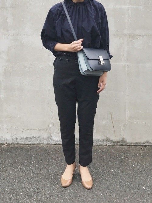 ユニクロのコットンギャザーブラウスのコーデ。スタンドカラーとバルーンスリーブが今年らしく大人気のブラウス。暗めのカラーでまとめた、シックな雰囲気のきれいめな着こなし。カラーを統一すると、大人っぽく落ち着いたコーデに◎パンツはHYKE、バッグはCELINEのもの。