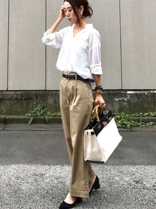 定番オフィスカジュアル!白シャツ×「チノワイドパンツ」