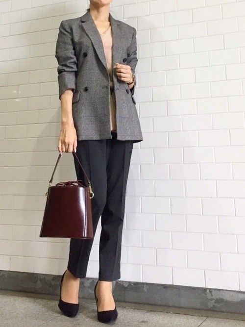 ユニクロのスマートスタイルアンクルパンツのコーデ。ウールライクの素材で、上品でスタイリッシュなパンツは、センタープレス入りでさらにきちんとしたイメージです。オンでもオフでも使いやすく、1本持っておくとスタイリングの幅が広がるオススメのパンツ◎GUのグレンチェックジャケットを合わせた、秋らしいオフィスカジュアルです。バッグ・パンプスはtitivateのもの。