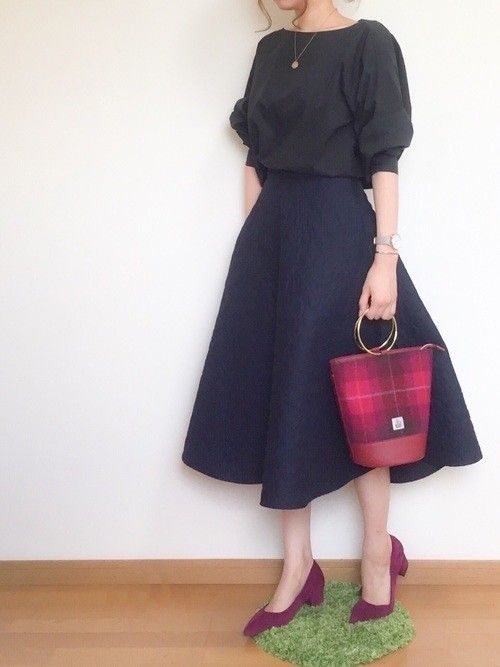 ユニクロのキルトスカートのコーデ。英国のファッションデザイナー、JW ANDERSONとのコラボのもので、ふんわり広がるボリュームがエレガントなスカート。Rouge vif la cleのブラウスに合わせた、上品できれいめな着こなし。きれいなパープルのパンプスと、赤チェックのバッグが大人可愛いアクセントに◎バッグはしまむらのもの。