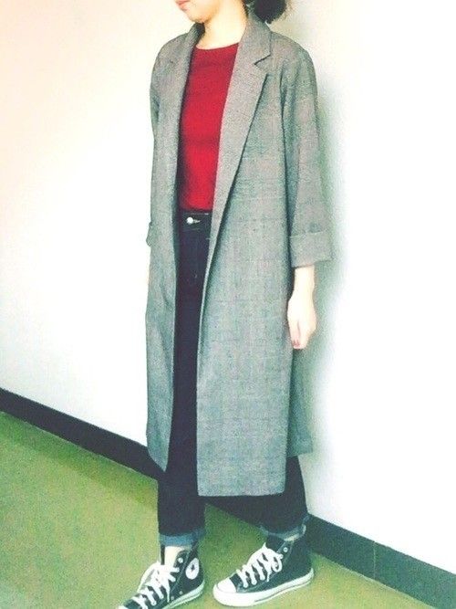 GUの【ライトガウンコート】は、グレンチェック柄を選ぶと今年らしくて洗練されたイメージに。秋にぴったりの、薄手のロングコートは、Iラインシルエットでスタイルアップ効果が期待できます◎赤のリブT、スキニーデニムはユニクロのもの。モノトーンに赤を効かせたシンプルな着こなしは、まさに大人カジュアル!