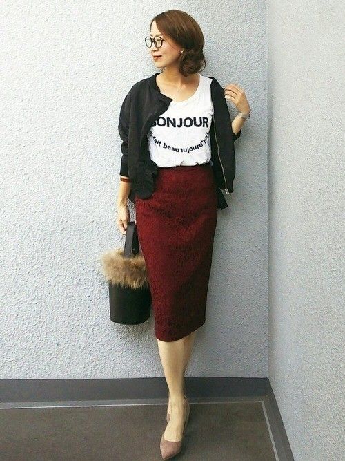 繊細なレースが高見えすると評判の、GU【レースタイトスカート】。ひざ下丈のタイトスカートは足を細く見せてくれる効果も◎秋冬らしいワインカラーは大人の女性によく似合います。ロゴT×フリルが女性らしいDanny&Anne のMA-1で、甘辛コーデが素敵です。DRWCYSのヌーディなパンプスを合わせて、足元をシックにすると落ち着いた雰囲気に