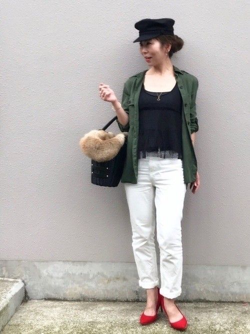 ホワイトデニムがGUのもの。ラメレースのタンクトップにZARAのミリタリーシャツを羽織ったカジュアルコーデに、ダイヤのネックレスで大人のクラス感をアップ!白デニム×SHIPS for women のウールマリンキャップでマリンな雰囲気に。流行りものをプチプラで」というイメージのGUですが、デニムなど定番アイテムも豊富に揃いますよ◎