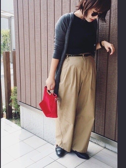 GUのベーシックな【チノウエストベルトワイドパンツ】に、こちらもGUの細ベルトを合わせてコーデをワンランクアップさせた着こなし。ロングカーデをさらっと羽織ったシンプルコーデ×差し色の赤のバッグがおしゃれ!プチプラでも大人っぽく見せるには、コーデを黒・ベージュなどのシンプルな色味に抑えることがポイント。色味は小物で足すと大人のおしゃれ感が出ます◎