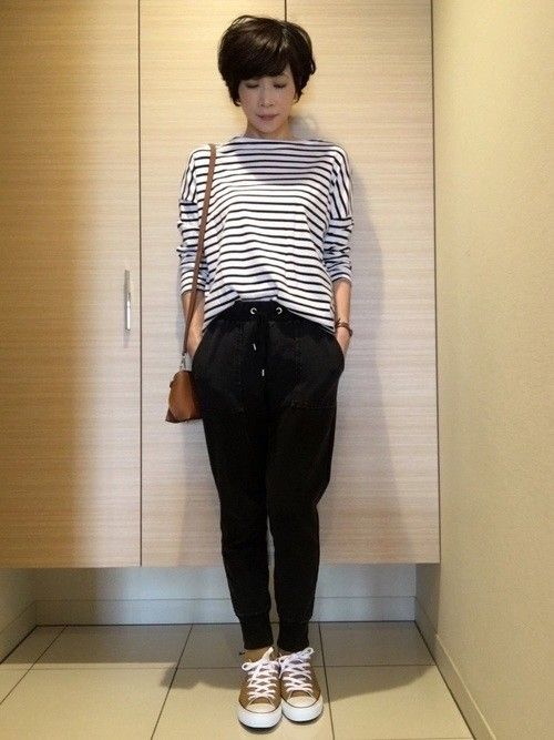 GUのスウェットイージーパンツは、スウェットだけどシルエットがきれいと評判の優秀パンツ◎FRAMeWORKのドロップショルダーのボーダーTをさらりと合わせた、シンプル大人カジュアル。トップスは、インして腕を少しまくればこなれ感ある着こなしに◎ショルダーバッグとコンバースをブラウンで合わせて、色味を抑えたコーデが大人の雰囲気です。