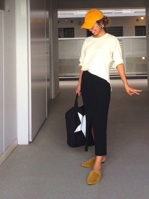GUの【フェイクファースリッパミュール】は、シャープなつま先がスタイリッシュ。トレンドのフェイクファー、GUならお手軽にゲットできます◎ワッフルTとリブタイトスカートはユニクロ。NEW ERAのキャップ&ミュールはマスタードで差し色を効かせて。オールトレンドアイテムも、白・黒でまとめて小物で差し色を取り入れれば、大人カジュアルな雰囲気に◎