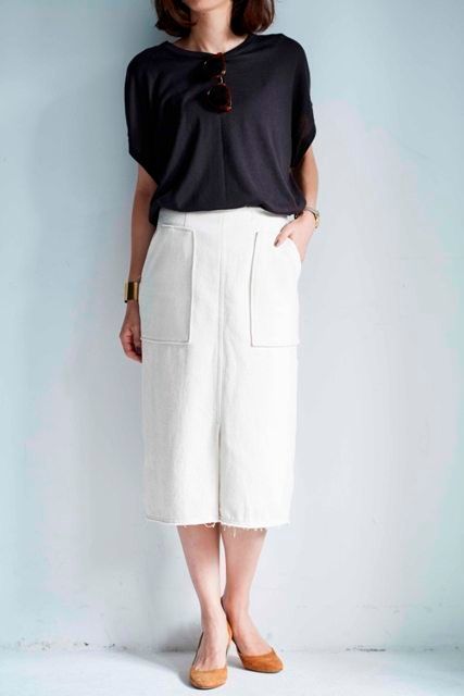 すそへ向かって細くなるシルエットが、腰回りから太ももまでをすっきりと補整してくれるペンシルスカート。大人はひざ下丈を選び、全身を細くIライン化すると◎。ギャザーがないので、ウエストが細く見える効果もあるんです!