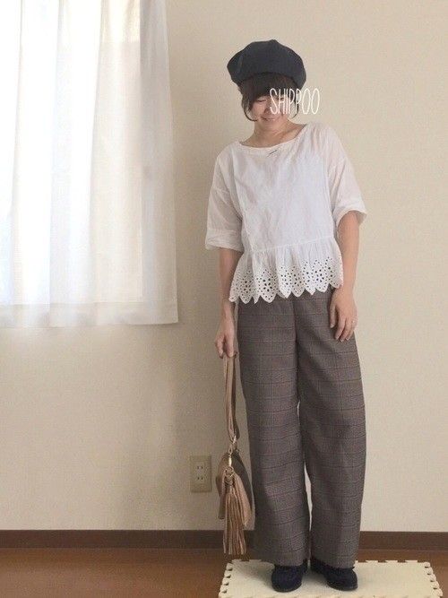 トップスとリボンワイドパンツがしまむらのもの。キャスケットとパンプスはGU。グレンチェックパンツやキャスケットなど、トレンドアイテムはプチプラで上手に取り入れて。きれいめカジュアルな着こなし。