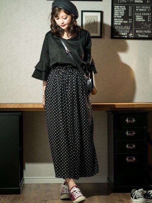 フリル袖ブラウスがしまむらのもの。秋冬も「盛り袖」人気続行中!Heatherのドットスカンツ・ベレー帽がレトロな雰囲気の秋コーデです。