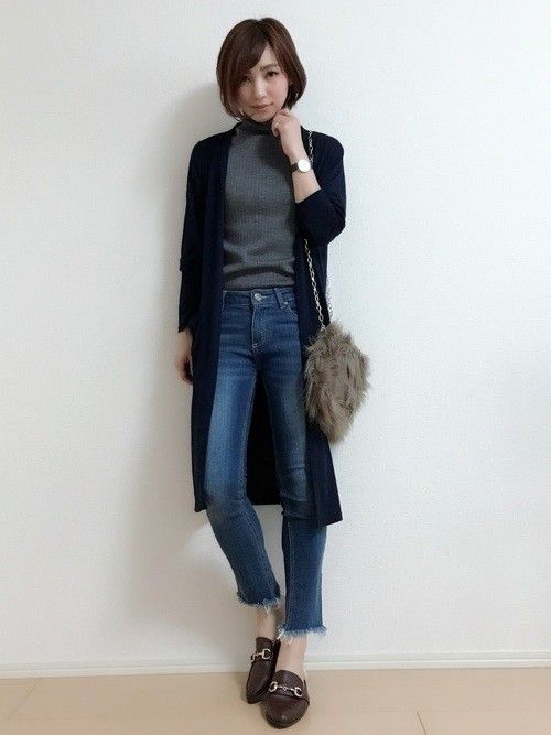 デニムがしまむらのもの。流行りものにはお金もかけたくない!いうママにおすすめの、しまむらのフリンジデニム。ストレッチ入りで柔らかく、股上も深めで動きやすいと高評価なんです◎ユニクロのタートルネックリブニットにロングカーディガンを羽織って秋らしく。GRLのファーバッグも季節感たっぷり!クールな雰囲気の秋コーデです。