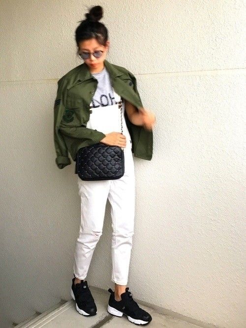 白のサロペットがしまむら。挑戦したいけど難易度が高そうなサロペットも、しまむらなら安心価格でトライしやすい!お手軽価格とは思えない、まさに「高見え」するシルエットの良さ◎インのTシャツはKBF、カーキジャケットはwho’s who ChicoのミリタリーMIXコーデ。