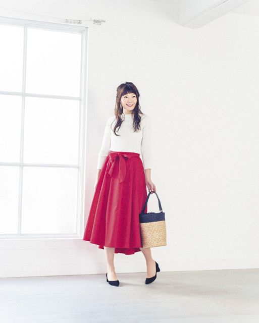 おしゃれをして気分を上げたいお出かけの日には、この春大トレンドのキレイ色フレアスカートとチャンキーヒールでエレガントな装いに。幼く見えがちなキレイ色を黒チャンキーが引き締めてくれます。