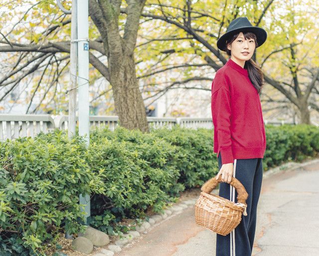 鮮やかな赤ニットにラインパンツを合わせた、スポーティな着こなし。ファーつきかごバッグのかわいげで、女性らしさをひとさじプラスして。