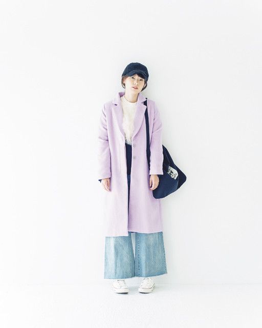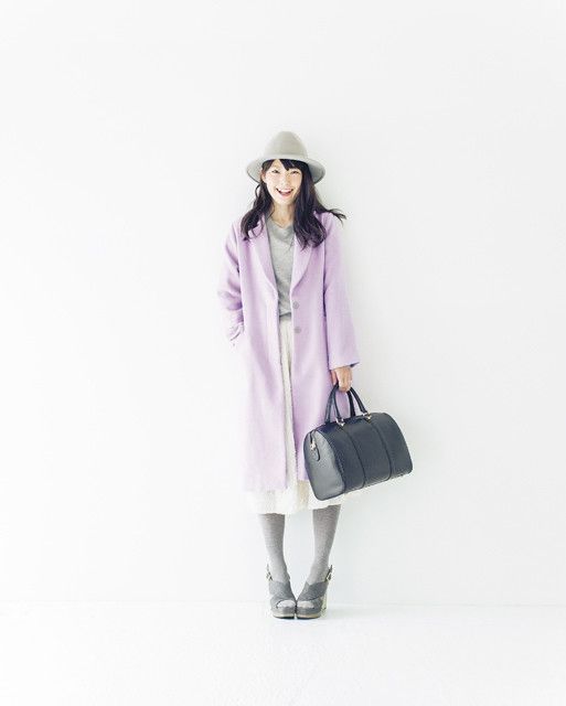 ラベンダーのチェスターコートを主役に、ほかをベーシックカラーでまとめると大人も挑戦しやすい! まろやかなグレートーンなら、女性らしい印象に。