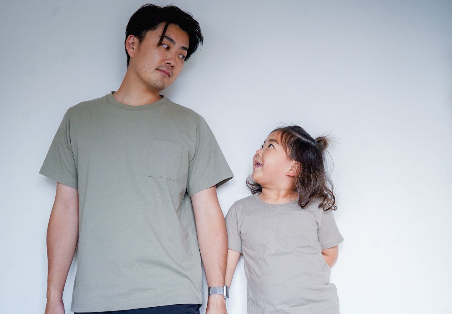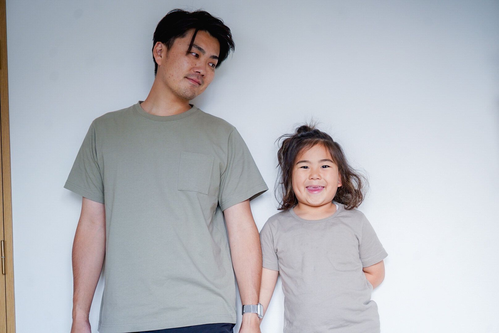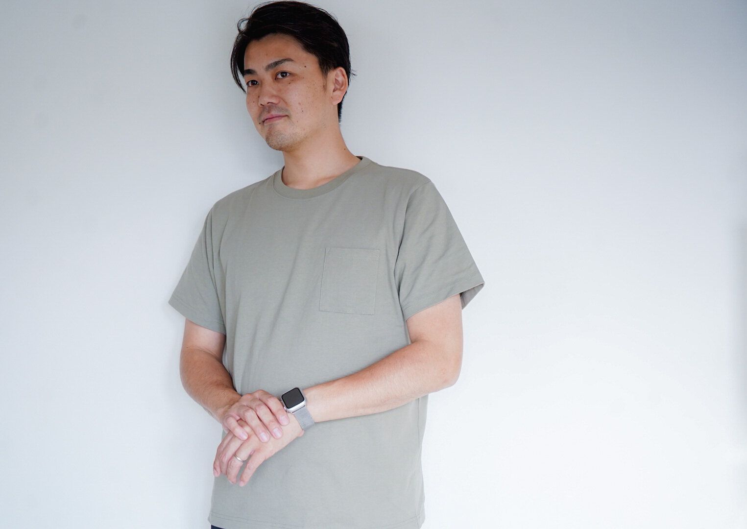 ちなみに着用カラーはアッシュカーキ。くすみ具合が少し古着チックで旦那さんもお気に入りの一枚です♪