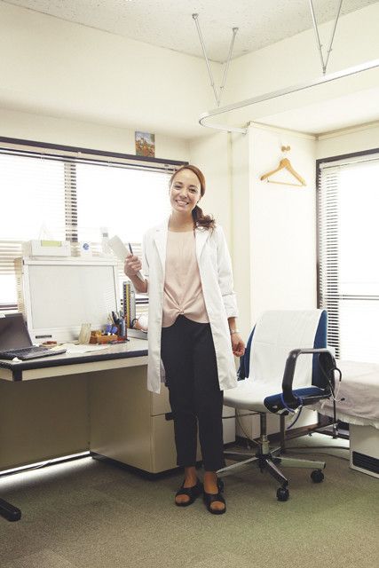 診察時は、いつもパンツスタイルです。白衣の下にすっきり収まるシルエットの服を着ることが多いですね。診察に集中したいので、髪の毛もキリッとまとめています。テレビ番組に出演するときは、カラフルな柄物のワンピース&巻き髪が多いので、イメージがちょっと違うかもしれませんね。