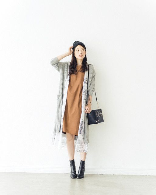 秋の注目カラー・テラコッタのワンピと合わせてフェミニンに。バンダナ柄のシフォンガウンをはさんで、無地のなかにちょっぴり表情をつけてみました。
