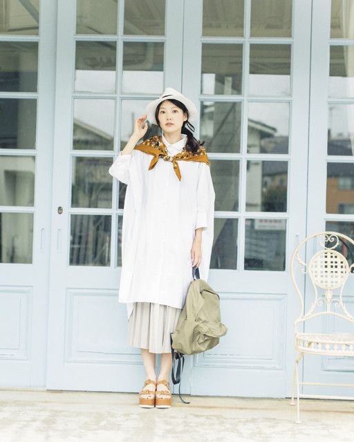 シャツワンピースの下にプリーツスカートをレイヤード。白・ベージュ・ブラウンのナチュラルグラデーションで、まだ暑い夏は涼しげな配色で♡