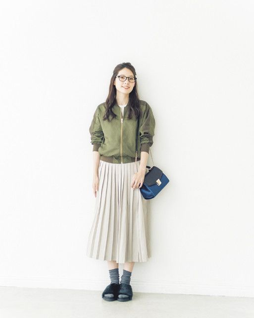 上品でトラッドな印象のプリーツスカートに、あえてMA-1を合わせてカジュアルダウン! ファーサンダルなどの小物で秋っぽく仕上げました。
