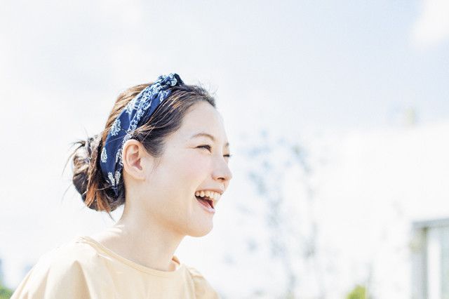 子どもと一緒のときは、髪は動きやすいようにまとめることが多いです。スカーフは折りたたんでヘアアクセとして。アクティブなイメージに仕上げます。