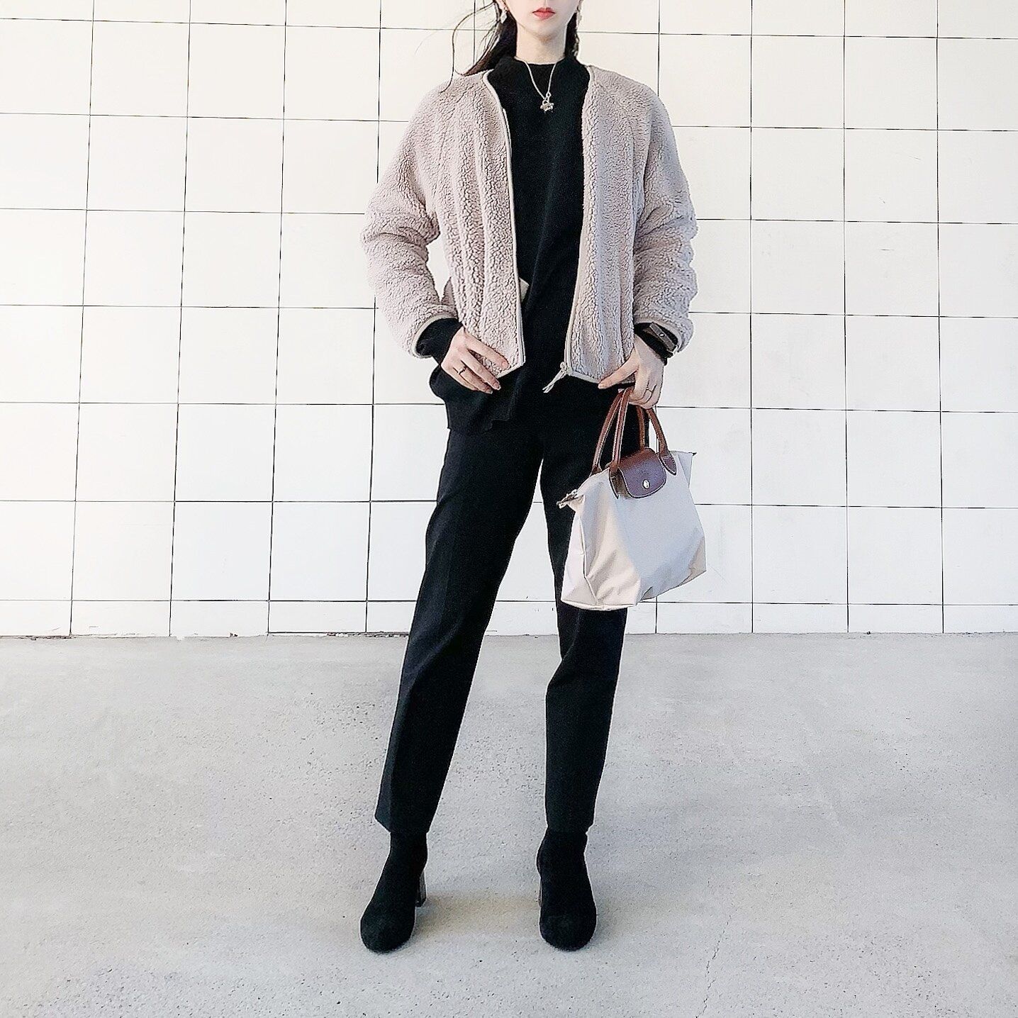 カチッとしすぎ感をボアフリースがいい感じにカジュアルにしてくれます。