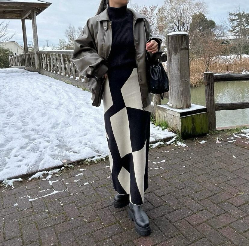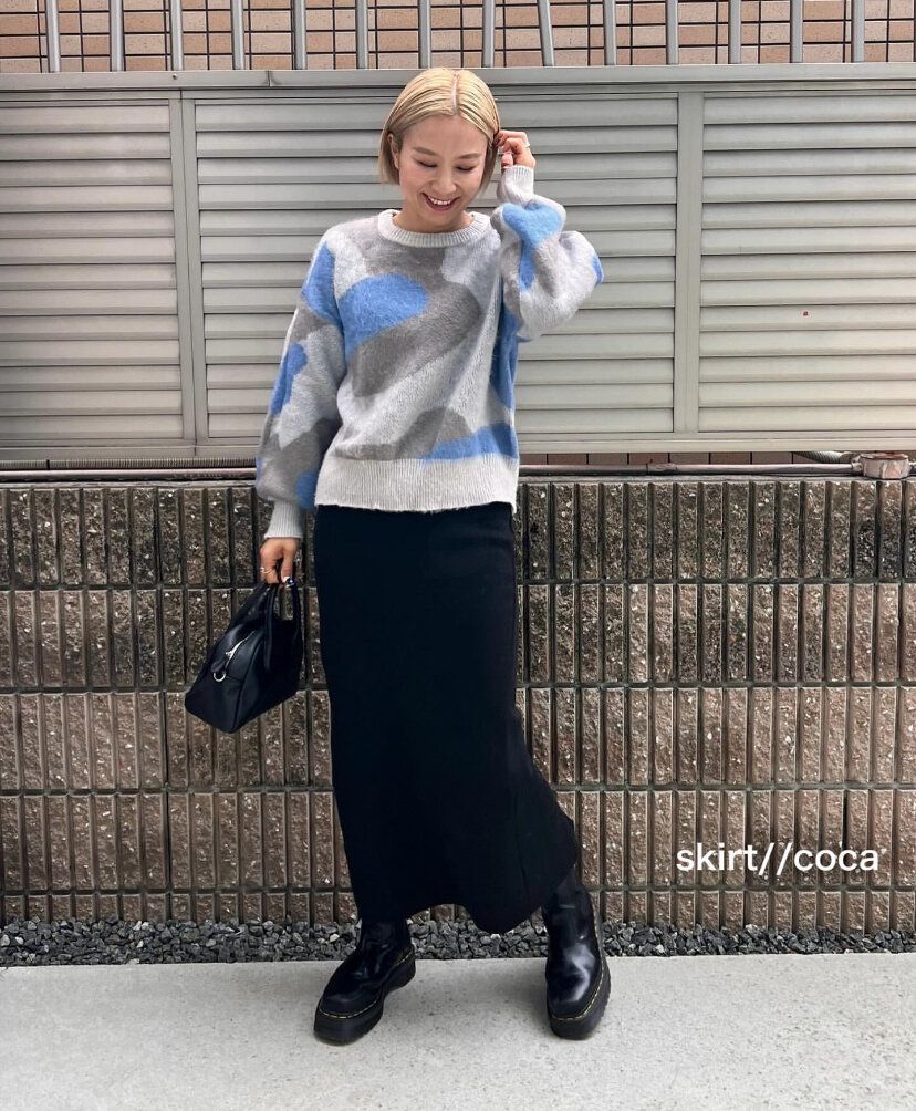 「ブロッキングJQスカート」(1,969円)は、今までのしまむらにはなかったような個性的な柄が話題の高見えアイテム。一見合わせるのが難しそうな柄に見えますが、カラーはモノトーンカラーなので無地のトップスならベーシックなカラーからビビッドなカラーまでほとんどのカラーを合わせる事が可能です。