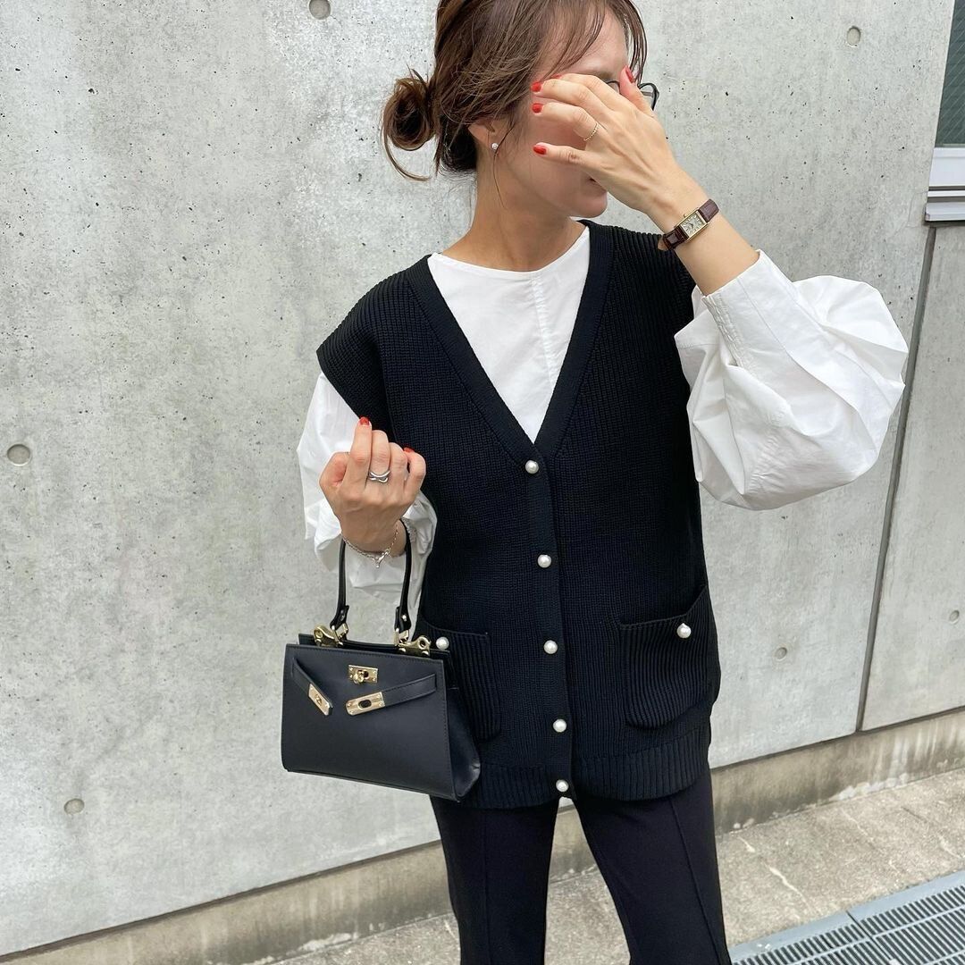 1.手持ち服に投入!パールつきベストで華やかに