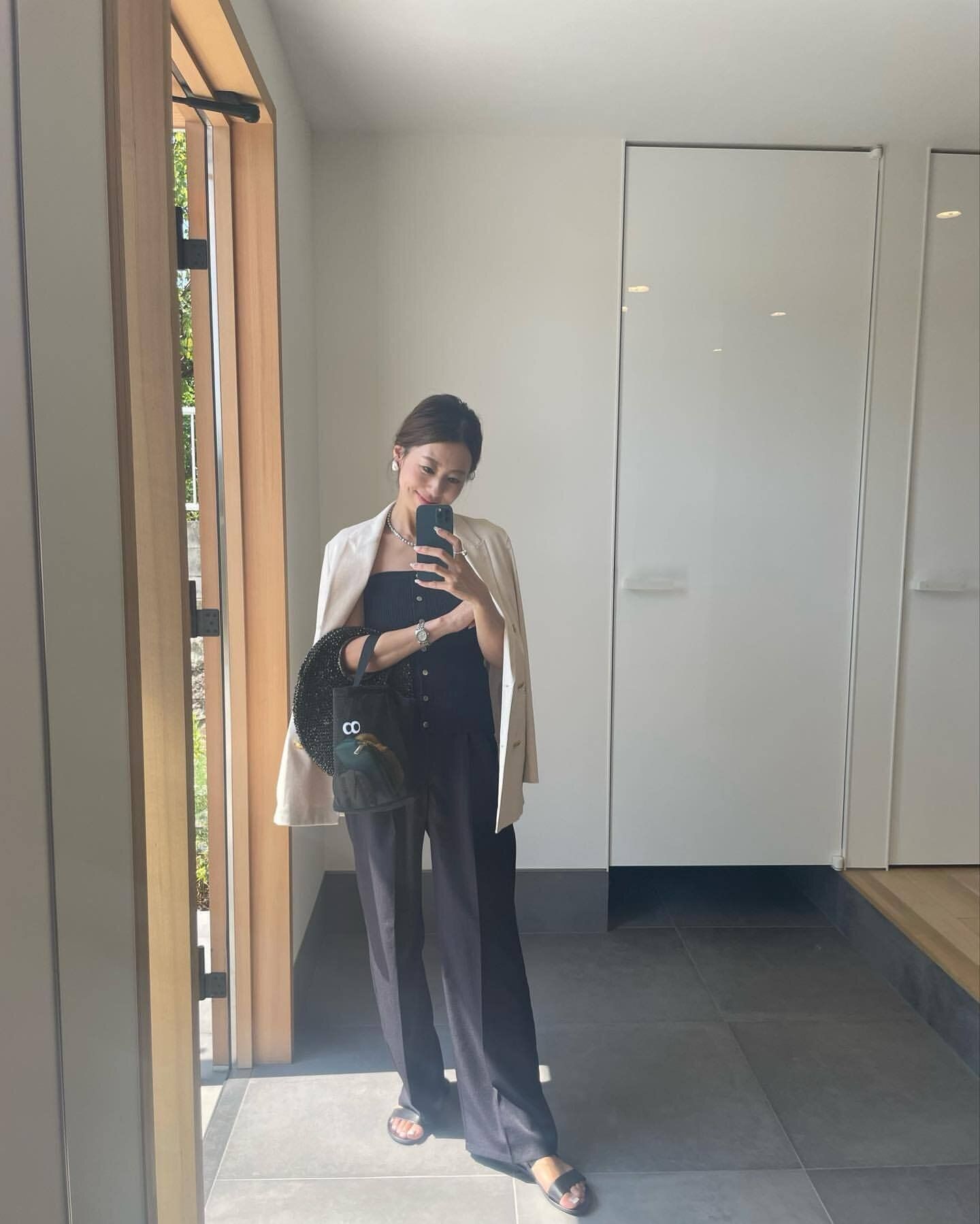 ビスチェ1枚で着るのは勇気がいるかもしれないけれど、ジャケットをサッと肩掛けして合わせるなら、挑戦できそう。仕事後に飲み会に行くときなどにビスチェだけチェンジできる手軽さもおすすめポイントです。キリリとしたモードな雰囲気になるので、マンネリになりがちな黒パンツスタイルとは無縁に!