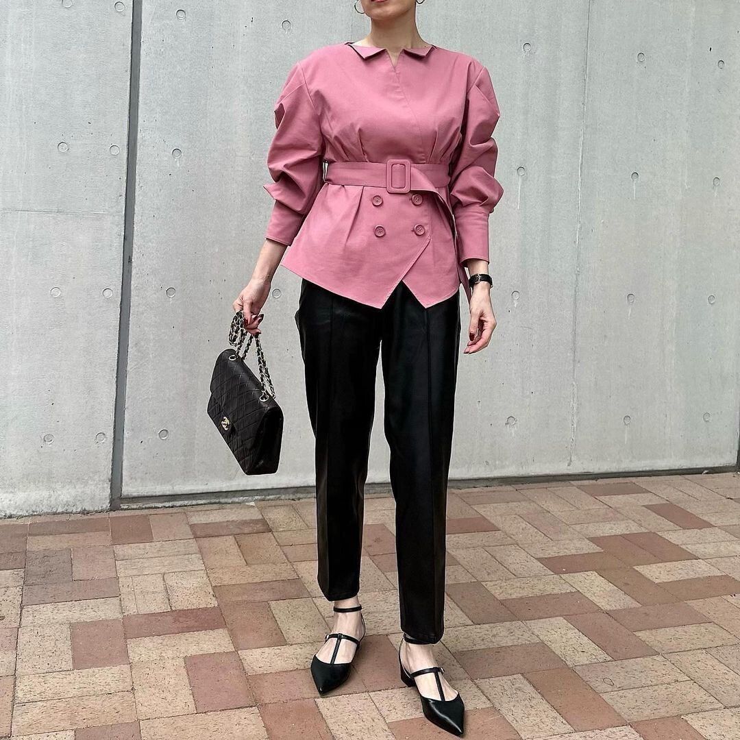 シックで華やかさがあるスタイルは、とくに女性から高評価。華やかなムードへと導いてくれる甘めのピンクトップスは、ママ友だけでお出かけする日に身に着けたいアイテム。デザイン性の高い甘めのトップスは、手持ち服の黒ボトムで引き算すると好バランス。バッグやシューズまで黒で統一させると、さらにシュッと引き締まって見えます。