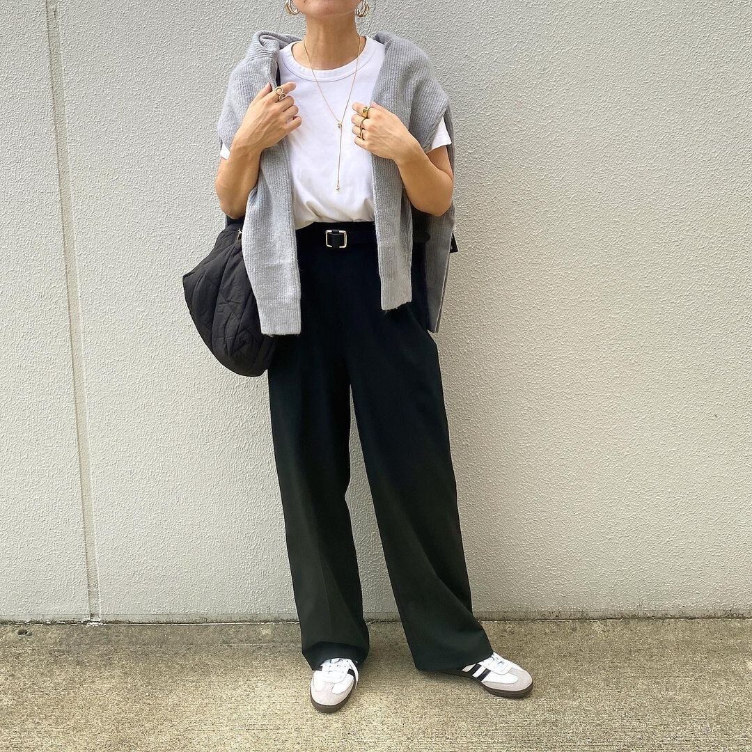 おしゃれのためはもちろん、寒暖調整のためにもニットを肩掛けすることってありますよね。なかなかニットの肩掛けがうまくいかない方は、全身バランスを整える意味でもベルトコーデまでマネしてみて。トップスはウエストインしてコンパクトに仕上げ、ベルトを加えるとまとまり感がアップします。