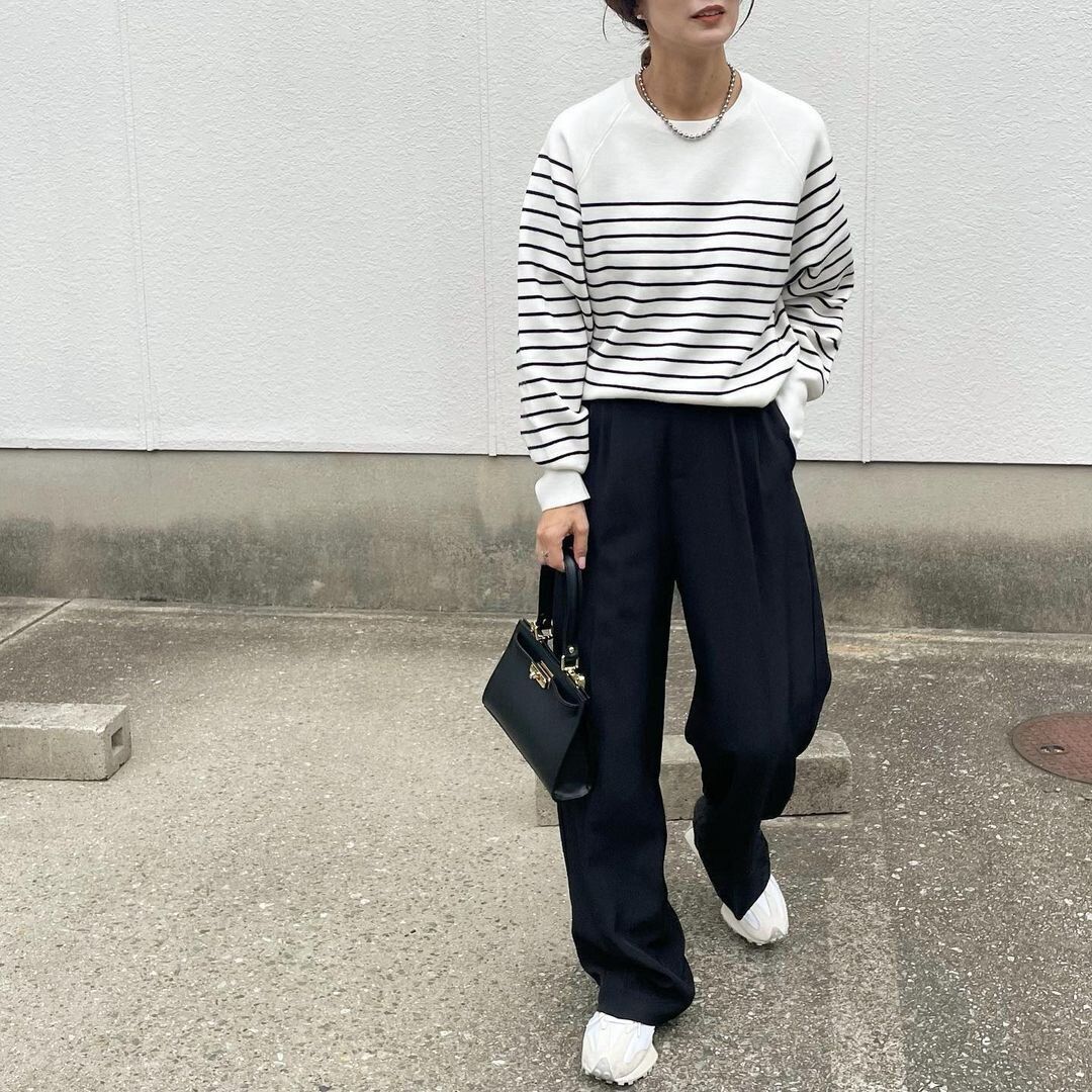 ボーダートップスは、張り切りすぎに見えずにメリハリ感がアピールできるので、普段使いしやすい優秀アイテム。ボーダーは、カットソーなど綿素材を選びがちですが、ニットにするとグッと大人っぽい雰囲気に。モノトーンに徹するとよりオシャレさが伝わります。